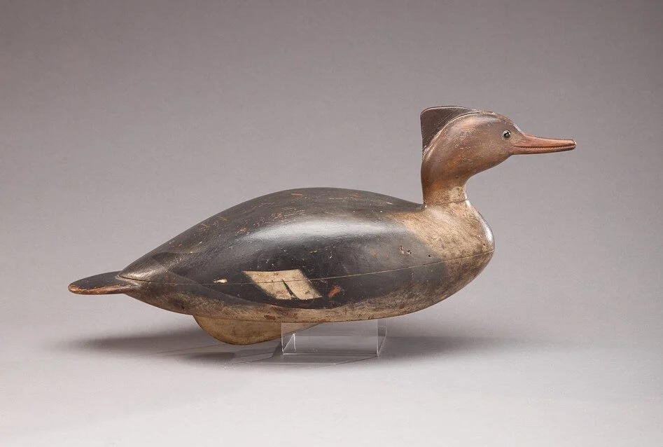 Session II showed the strength of the decoy market. The hissing Canada goose pair ($200/300,000) by Harry V. (1861-1920) and Harry M. Shourds (1890-1943), brought the top price for day two, coming in at $201,250. Lot 366, the red-breasted merganser hen from the Captain Samuel Augustus Fabens (1814- 1899) rig was the mover of the auction. It shattered its $15/25,000 estimate, with two phone bidders driving it up to $184,000.